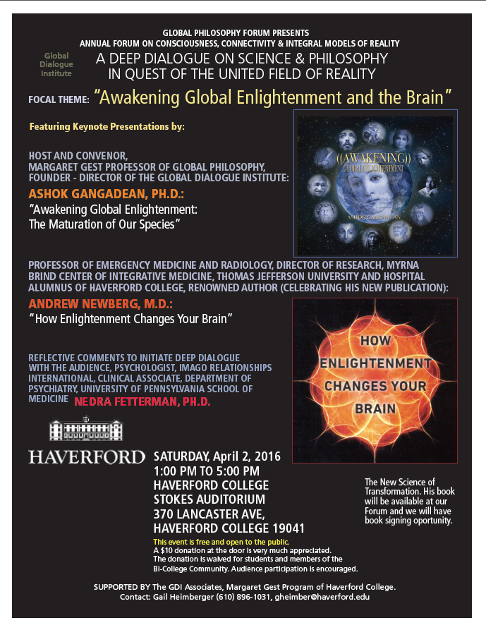 ((Dear Forum Friends- Greetings. I am delighted to share the good news concerning our next ((Philosophy Forum)) at Haverford College on April 2nd 2016 featuring Dr. Andrew Newberg. It's a month away and I wanted to get this news to you so you can save the date. I attach the poster (also pasted in below), and I attach also an item on Andrew's latest book: Enlightenment and the Brain. This book is being released in a couple weeks and Andrew will have a book signing at our Forum on April 2nd. Please see the detailed note about Andrew's important pioneering work. He is an alumnus of Haverford and we're proud of him! I will open our event presenting key highlights from my recently released double CD audio ((Awakening Global Enlightenment)) and Dr Nedra Fetterman will add her voice to stir deep dialogue with the audience on this frontier topic. To learn a little more about my Cd please click this link for a press release. [ http://hav.to/1ox ]